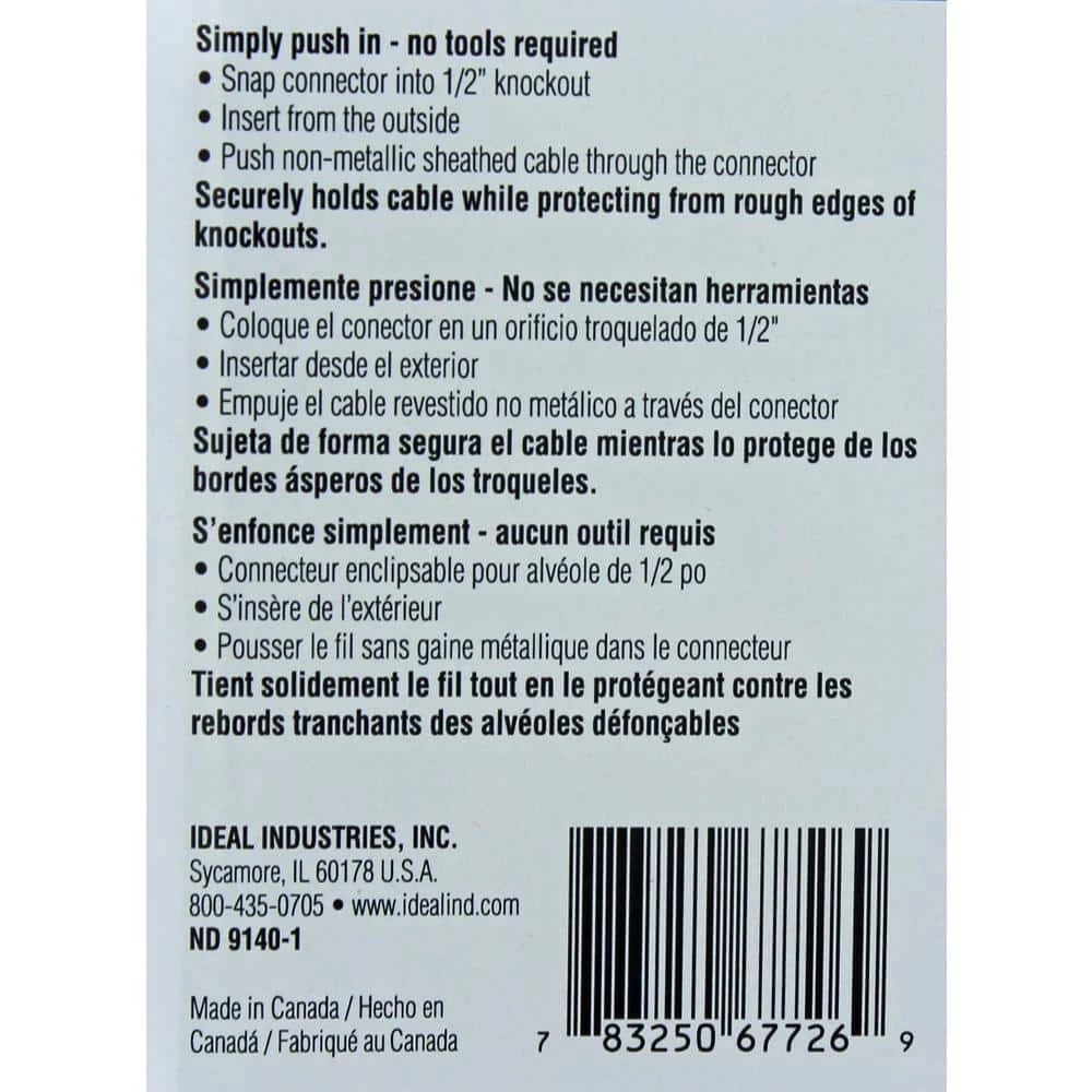 The iDEAL Quick Snap connector provides exceptional performance and incredible value. Quick Snap can be installed quickly and easily, without the use of tools, securing cable in place and providing superior protection from damage that can be caused by rough knock-out edges. Simply push in – no tools required.