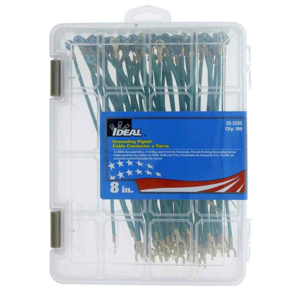Coming in various lengths and styles, iDEAL grounding pigtails are designed for a wide variety of grounding applications to help ensure compliance with article 250 of the National Electric Code. Whether you need solid or stranded, fork or stripped end, small packaging for the occasional use or bulk packaging for the big jobs, we have a solution. The ultra-flexible lead wire and bonding jumpers make for fast and efficient pig tailing and the thread-forming, hole finding ground screw cuts down on installation time.