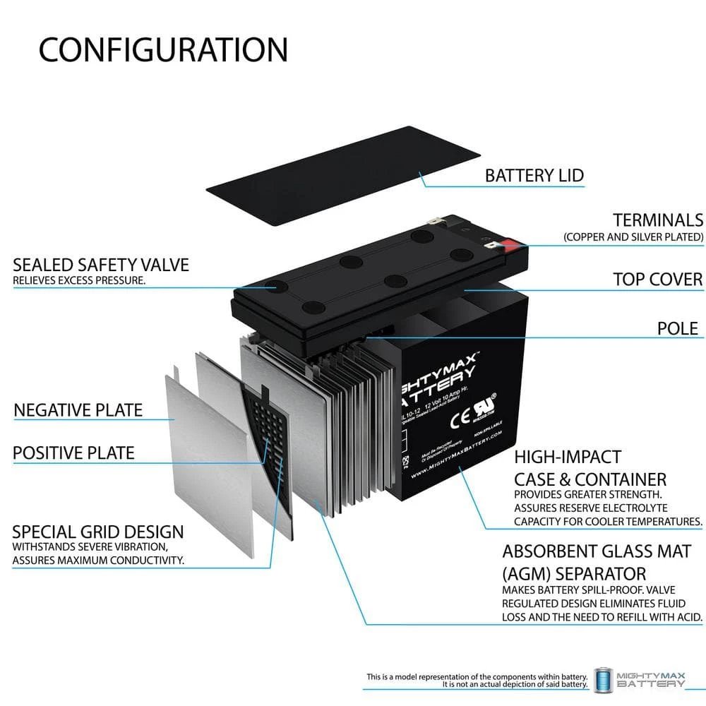 Delivering power when you need it, the MIGHTY MAX ML10-12 12-Volt 10 Ah uses a state of the art, heavy-duty, calcium-alloy grid that provides exceptional performance and service life in both float and cyclic applications. The ML10-12 is an Absorbent Glass Mat (AGM) technology with a valve regulated design, that can be used in enclosed and indoor environments without leaking or maintenance, providing a superior performance for thousands of models. MIGHTY MAX batteries are utilized in a wide variety of applications including, Consumer Electronics, Electric Vehicles, Engine Starters, Golf Carts, Hunting, Lawn and Garden Tools, Medical Mobility, Motorcycles, Power sports, Portable Tools, Solar, Toys and Hobby, Access Control Devices, Emergency Lighting, Security and more.