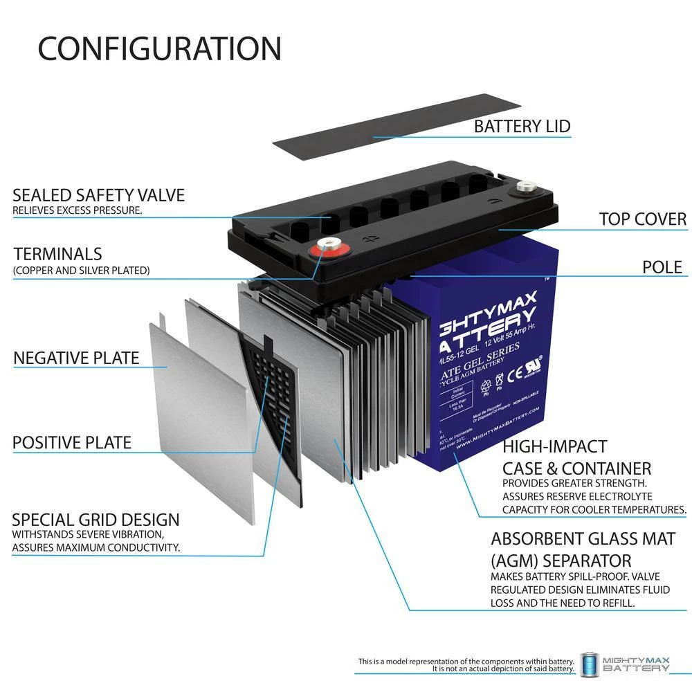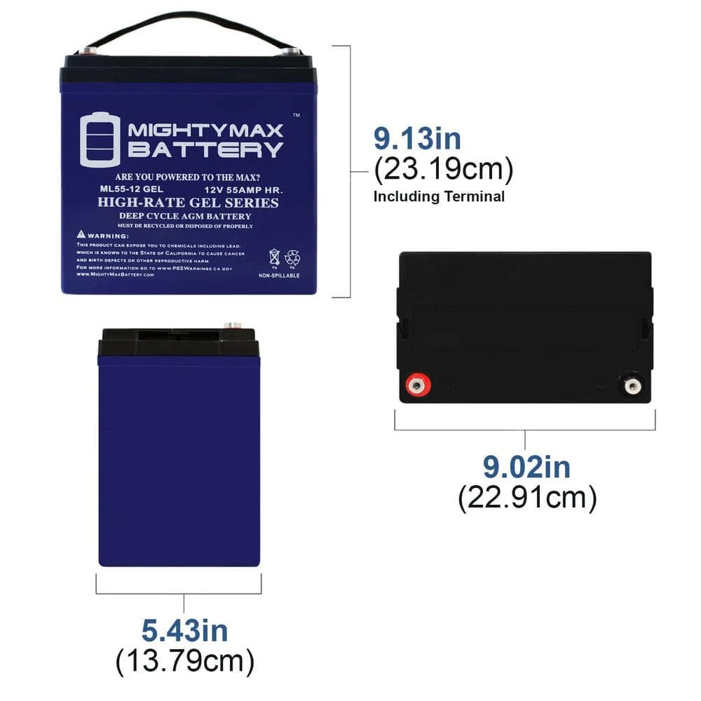 Delivering power when you need it, the Mighty Max ML55-12GEL 12-Volt 55 Ah (Maintenance Free) battery. Requires no addition of water during the life of the battery. The Mighty Max ML55-12 GEL is a TRUE DEEP CYCLE battery that can be mounted in any position, requires no maintenance. When a Gel Cell battery is charged, no hazardous fumes escape the battery case, gases are processed within the battery itself. Mighty Max GEL batteries are utilized in a wide variety of applications including; Consumer Electronics, Electric Vehicles, Engine Starters, Golf Carts, Hunting, Lawn and Garden Tools, Medical Mobility, Motorcycles, Power sports, Portable Tools, Solar, Toys and Hobby, Access Control Devices, Emergency Lighting, Security and more.