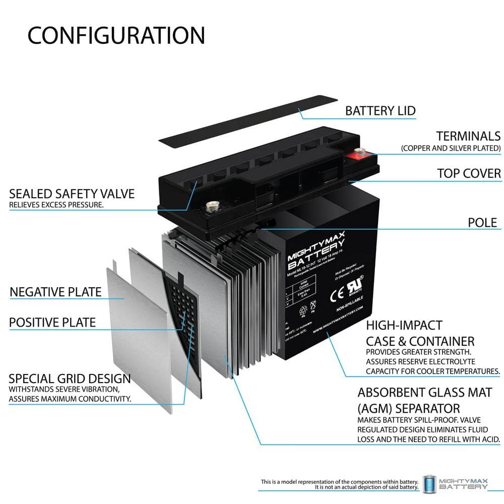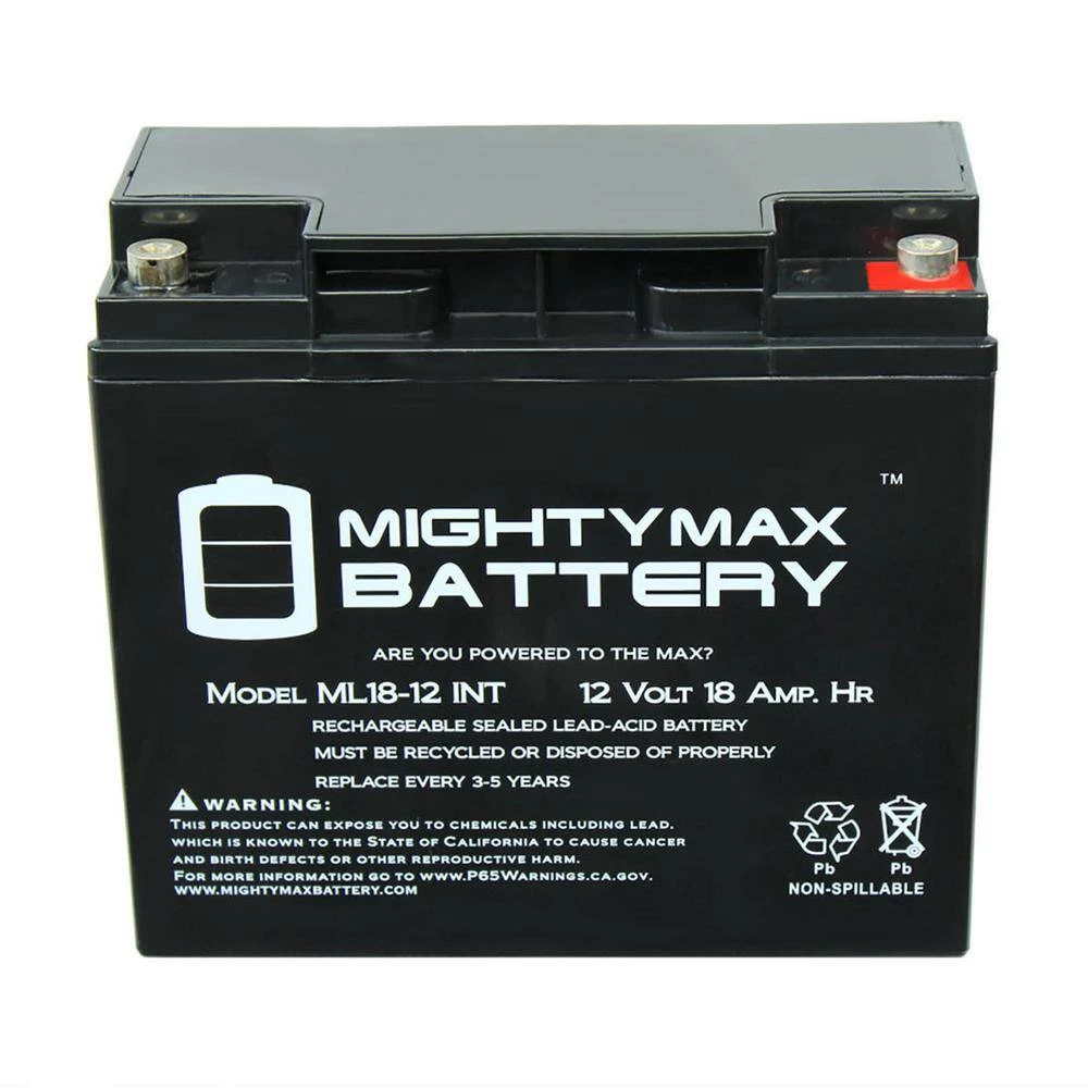 Delivering power when you need it, the Mighty Max ML18-12 Internal Thread 12-Volt 18 Ah uses a state of the art, heavy-duty, calcium-alloy grid that provides exceptional performance and service life in both float and cyclic applications. The ML18-12 Internal Thread is an Absorbent Glass Mat (AGM) technology with a valve regulated design, that can be used in enclosed and indoor environments without leaking or maintenance, providing a superior performance for thousands of models. Mighty Max SLA batteries are utilized in a wide variety of applications including; Consumer Electronics, Electric Vehicles, Engine Starters, Golf Carts, Hunting, Lawn and Garden Tools, Medical Mobility, Motorcycles, Power sports, Portable Tools, Solar, Toys and Hobby, Access Control Devices, Emergency Lighting, Security and more.