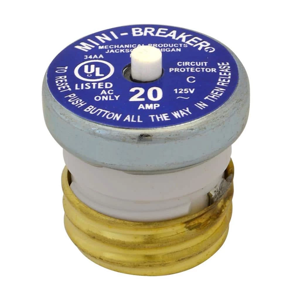 Mini-breaker for permanent fuse replacement. Replaces most Edison base fuses. A press of the button restores current. Built-in time delay prevents nuisance tripping during appliance start-ups.