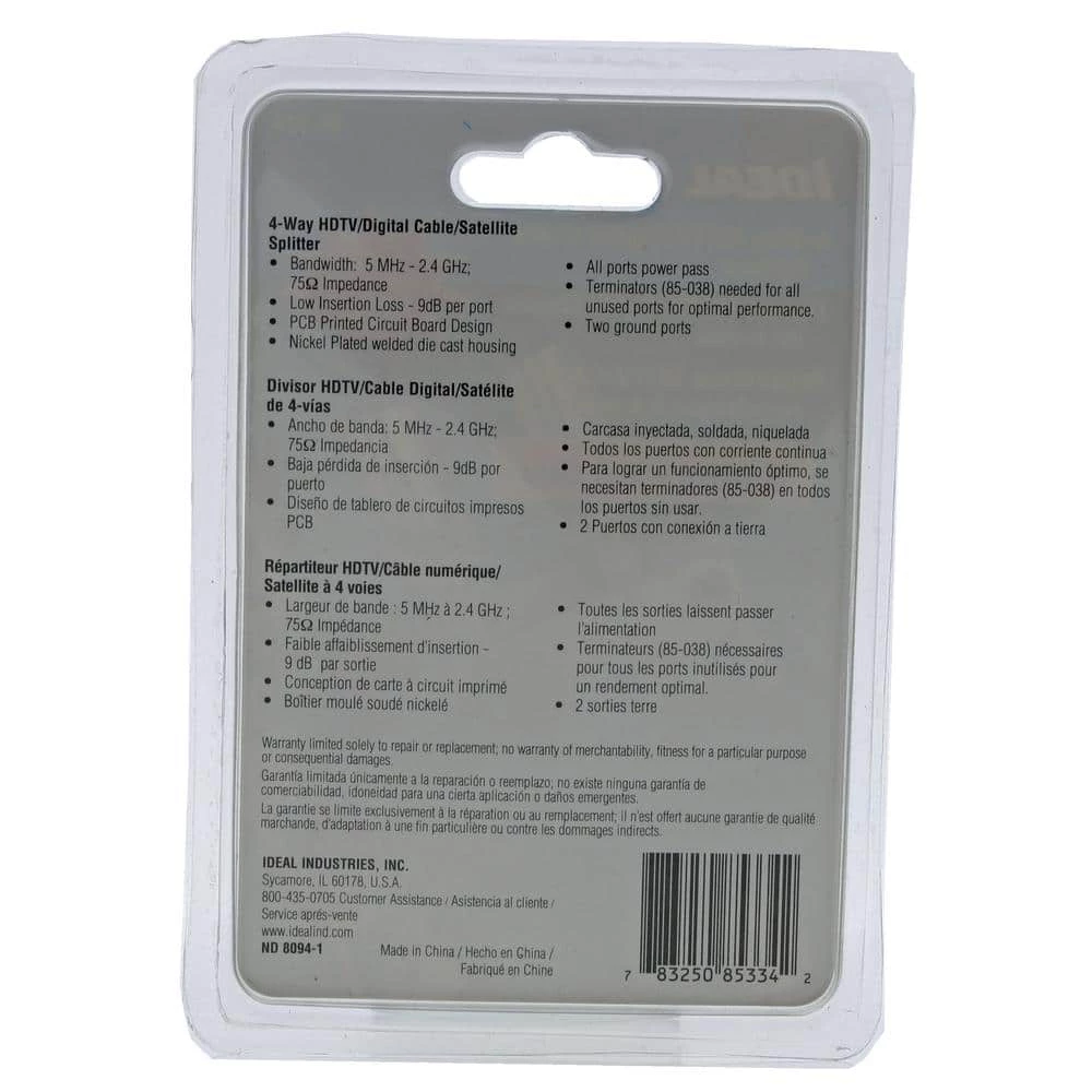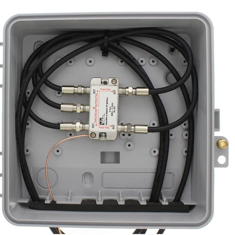 High performance 2.4 GHz Digital Splitters are used for splitting a single coax line into four lines. These splitters are designed for applications that operate in the 5 MHz to 2.4 GHz range, which include Satellite, Digital/HD Cable TV, Broadcast (over the air) TV, CCTV and other general-purpose coaxial cable splitting requirements. Splitters support the 1 GHz to 2.4 GHz frequency range for satellite and on-demand cable television services. All ports on the 2.4 GHz splitters are power pass enabled. This allows any of the ports to be used to pass power from the satellite set top box to the satellite dish or multi-switch. All splitters include an internal printed circuit board design inside of a nickel plated zinc die cast housing which helps to improve overall splitter performance in return loss, insertion loss and port-to-port isolation measurements, resulting in a stronger, cleaner signal with more protection from outside signal interference. All 2.4 GHz splitters have a solid, sealed body for improved EMI/RFI performance. Machine formed threads on the F ports allow for smooth connector mating.