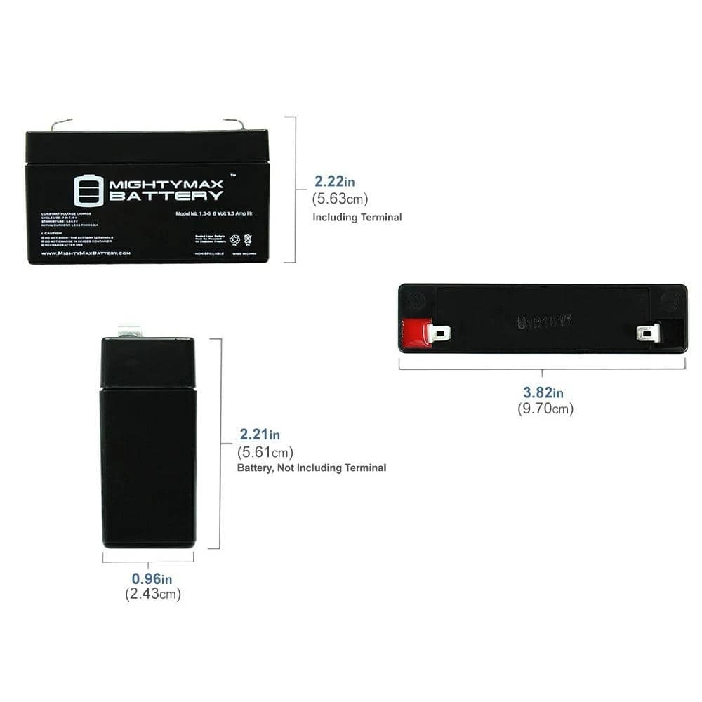 Delivering power when you need it, the MIGHTY MAX ML1.3-6 6-Volt 1.3 Ah uses a state of the art, heavy-duty, calcium-alloy grid that provides exceptional performance and service life in both float and cyclic applications. The ML1.3-6 is an Absorbent Glass Mat (AGM) technology with a valve regulated design, that can be used in enclosed and indoor environments without leaking or maintenance, providing a superior performance for thousands of models. MIGHTY MAX SLA batteries are utilized in a wide variety of applications including, Consumer Electronics, Electric Vehicles, Engine Starters, Golf Carts, Hunting, Lawn and Garden Tools, Medical Mobility, Motorcycles, Power sports, Portable Tools, Solar, Toys and Hobby, Access Control Devices, Emergency Lighting, Security and more.