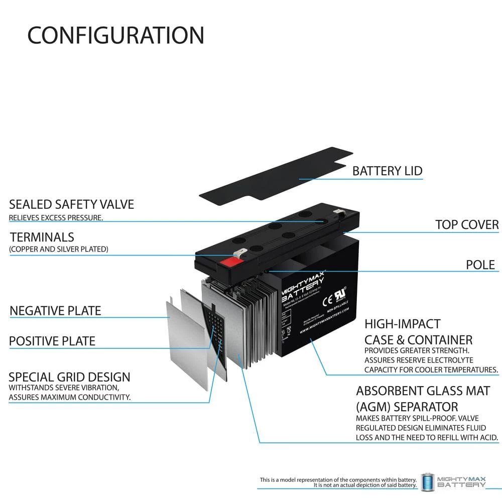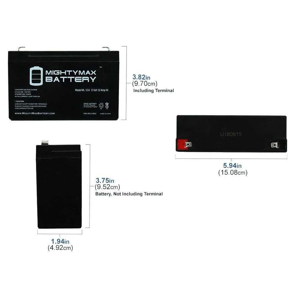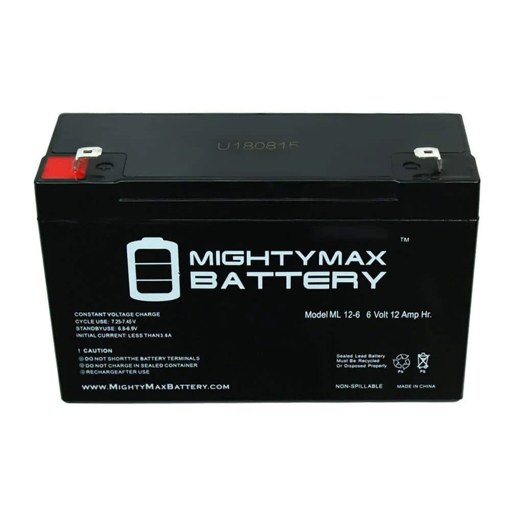 Delivering power when you need it, the MIGHTY MAX ML12-6F2 6-Volt 12 Ah uses a state of the art, heavy-duty, calcium-alloy grid that provides exceptional performance and service life in both float and cyclic applications. The ML12-6F2 is an Absorbent Glass Mat (AGM) technology with a valve regulated design, that can be used in enclosed and indoor environments without leaking or maintenance, providing a superior performance for thousands of models. MIGHTY MAX SLA batteries are utilized in a wide variety of applications including, Consumer Electronics, Electric Vehicles, Engine Starters, Golf Carts, Hunting, Lawn and Garden Tools, Medical Mobility, Motorcycles, Power sports, Portable Tools, Solar, Toys and Hobby, Access Control Devices, Emergency Lighting, Security and more.