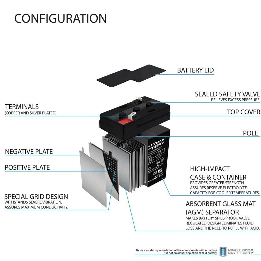 Delivering power when you need it, the MIGHTY MAX ML4-6 6-Volt 4.5 Ah uses a state of the art, heavy-duty, calcium-alloy grid that provides exceptional performance and service life in both float and cyclic applications. The ML4-6 is an Absorbent Glass Mat (AGM) technology with a valve regulated design, that can be used in enclosed and indoor environments without leaking or maintenance, providing a superior performance for thousands of models. MIGHTY MAX SLA batteries are utilized in a wide variety of applications including, Consumer Electronics, Electric Vehicles, Engine Starters, Golf Carts, Hunting, Lawn and Garden Tools, Medical Mobility, Motorcycles, Power sports, Portable Tools, Solar, Toys and Hobby, Access Control Devices, Emergency Lighting, Security and more.