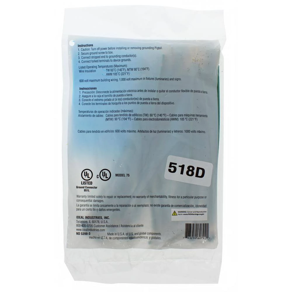 Coming in various lengths and styles, Ideal Grounding Pigtails are designed for a wide variety of grounding applications to help ensure compliance with the National Electric Code. Whether you need solid or stranded, fork or stripped end, small packaging for the occasional use or bulk packaging for the big jobs, we have a solution. The ultra-flexible lead wire and bonding jumpers make for fast and efficient pig tailing and the thread forming, hole finding ground screw cuts down on installation time.