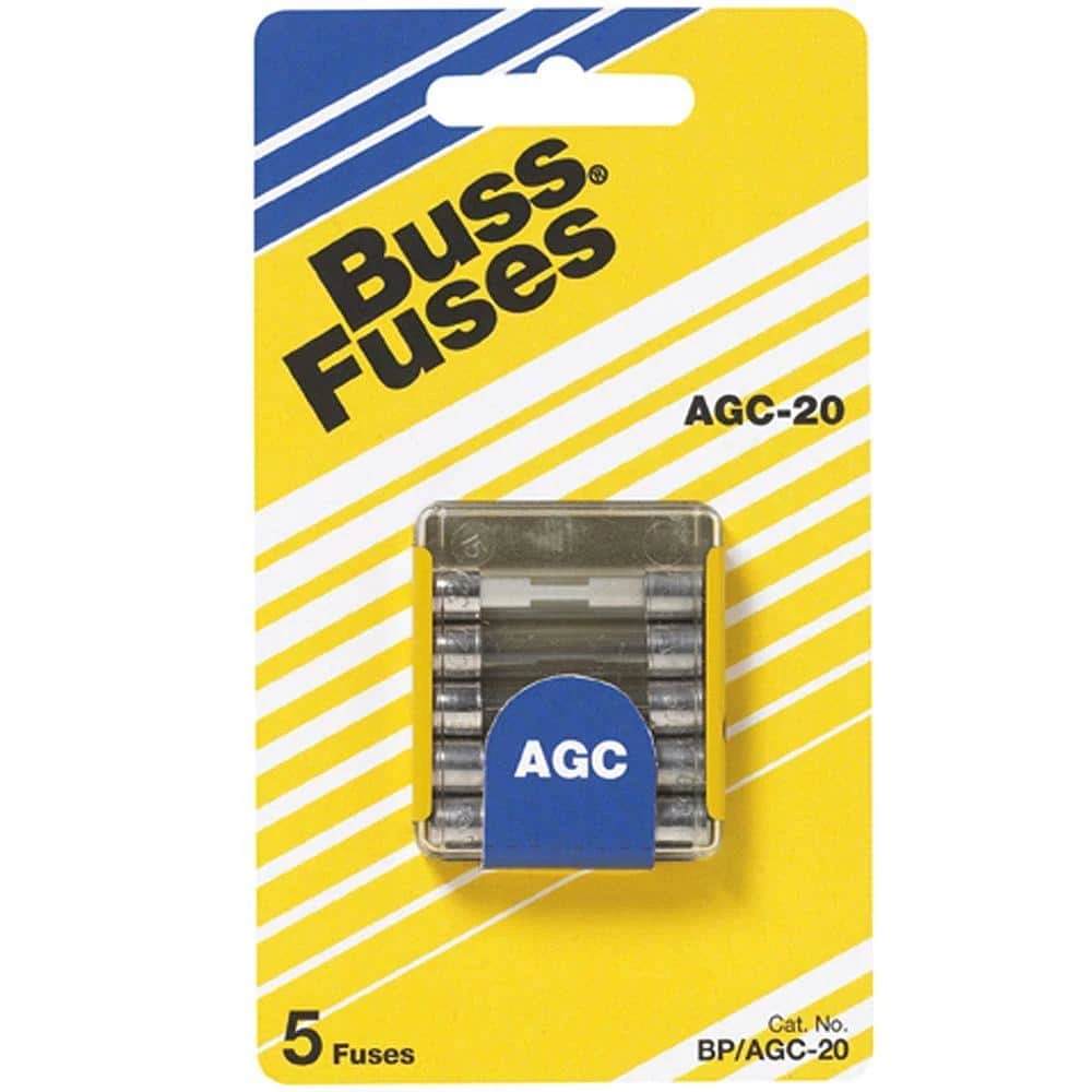 The Cooper Bussmann AGC Series 20 Amp Silver Glass-Tube Fuses (5-Pack) are CSA- and UL listed. The fuses are constructed of glass tubes with nickel-plated-brass end caps. These cartridges are intended for use with electronic-circuit applications and feature up to 32 Volts.