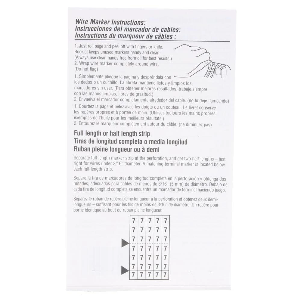 This Wire Marker Booklet features perforated 1/4 in. x 1-1/2 in. markers that can be separated into half-length sizes. The booklet is constructed of plastic-impregnated cloth. Self-sticking on wire and cable. Legend 0-9 numbers.