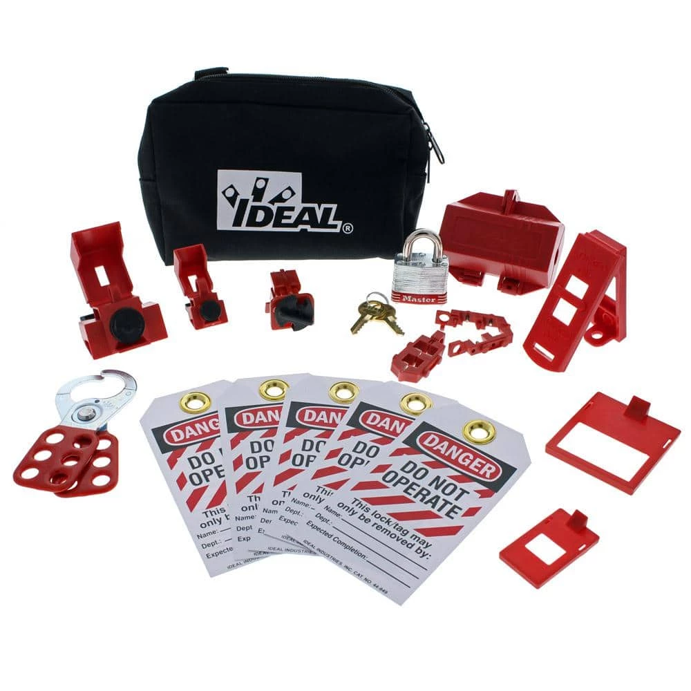 The Basic Lockout/Tagout Kit from Ideal includes a selection of the most popular lockout/tagout devices, enclosed in a small zipper pouch with belt loops and rings for convenient carrying. All hinged lockouts with locking post design, lock lever in OFF position to seclude and prevent breaker use. The Padlock with Red bumper features 3/4 in. shackle that is coated with rustproof steel and has a nickel-plated shackle to withstand abuse/environmental hazards. Also comes with two brass keys for the padlock. The Heavy-Duty Lockout Tags with Do Not Operate legend provide high-visibility and are made of plastic that resists corrosive/harsh environmental conditions. Write-on tag with 7/8 in. grommet can be fixed to device to avoid illegal removal.