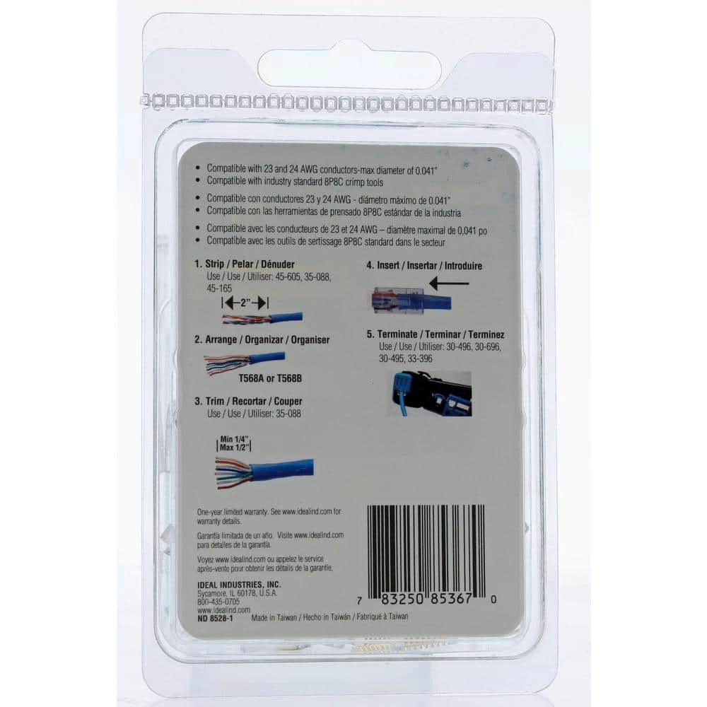 Ideal Single Piece CAT6 modular plug connectors simplify cable to connector assembly by eliminating the traditional sled and liner 3 piece connector design. An open body design allows CAT6 conductors to be untwisted, aligned and trimmed down to 1/4 in. – 1/2 in. for insertion into the connector. A standard RJ-45 style crimp tool is used to attach the connector to the cable.