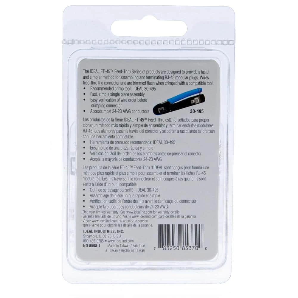 CAT6 Feed-Thru connectors are single piece connectors that use the same assembly process, no special assembly or multiple pieces for CAT6. Open-end Feed-Thru connectors offer several advantages over standard closed end connectors. Conductor order can be verified prior to crimping. Conductors that Feed-Thru the connector are inserted far enough to be pierced by the pin below. The cable can be pushed or pulled into the connector to ensure that the twisted pairs are as close to the pin contacts as possible and that the jacket is seated beyond the primary strain relief for a secure connection. A patent pending design enables conductors to be cut flush with the end face of the connector when used with the FT-45 tool.