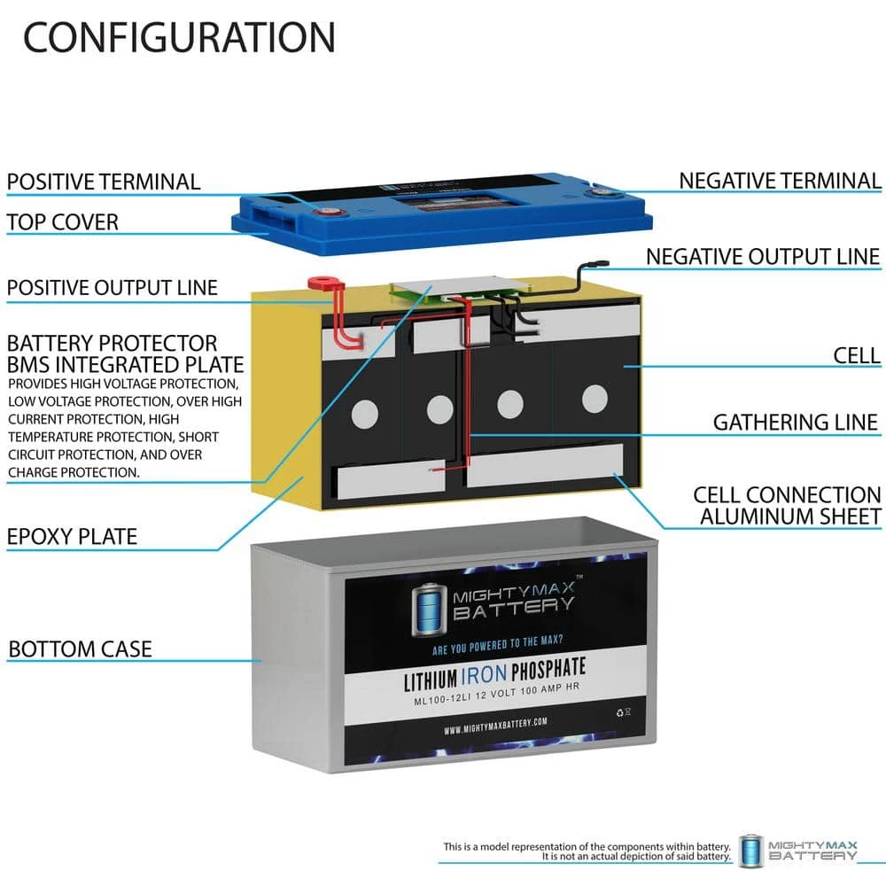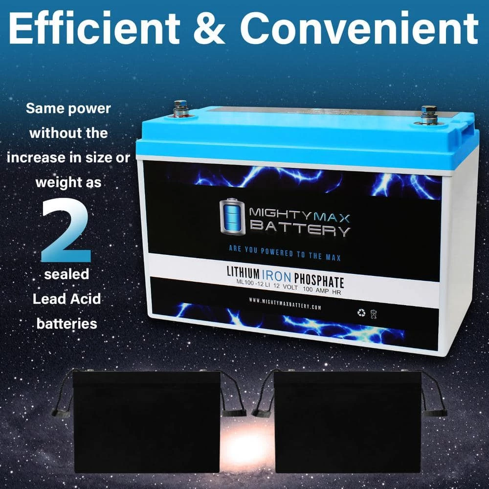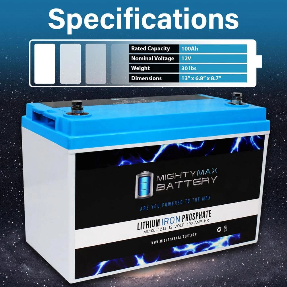 Invest in power with the Mighty Max 12-Volt 100Ah Lithium Iron Phosphate Battery. The ML100-12LI will take your deep cycle battery experience to a whole new horizon. Manufactured with the highest quality components and the customers safety in mind, this battery contains a battery management system (BMS). BMS provides all kinds of protection for the battery and customer, equipped with Over charge and short circuit protection. Weighing only 30 lbs. and being a direct drop in replacement for its sister sealed lead acid and Gel batteries which weigh a hefty 60 lbs. Lighter, stronger and longer life span with 2500 cycles makes this the ideal battery for all your deep Cycle applications such as, Solar / wind energy systems, Off Grid systems, RV, Camping, Backup power systems and much more.