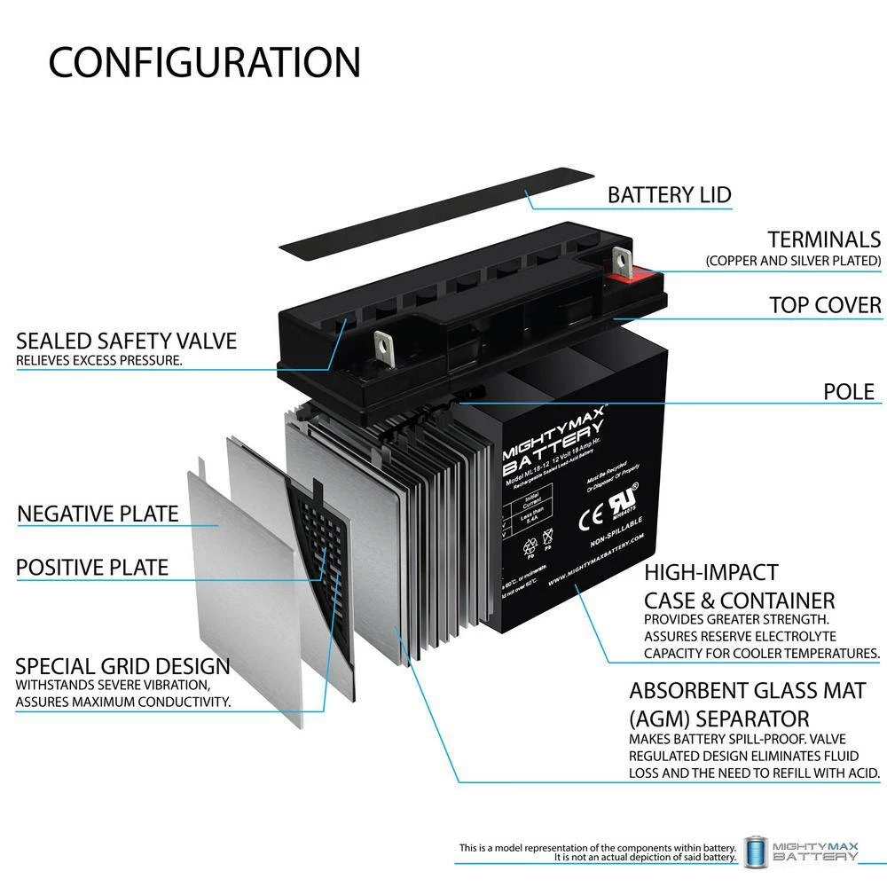 Delivering power when you need it, the MIGHTY MAX ML18-12 12-Volt 18 Ah uses a state of the art, heavy-duty, calcium-alloy grid that provides exceptional performance and service life in both float and cyclic applications. The ML18-12 is an Absorbent Glass Mat (AGM) technology with a valve regulated design, that can be used in enclosed and indoor environments without leaking or maintenance, providing a superior performance for thousands of models. MIGHTY MAX SLA batteries are utilized in a wide variety of applications including, Consumer Electronics, Electric Vehicles, Engine Starters, Golf Carts, Hunting, Lawn and Garden Tools, Medical Mobility, Motorcycles, Power sports, Portable Tools, Solar, Toys and Hobby, Access Control Devices, Emergency Lighting, Security and more.