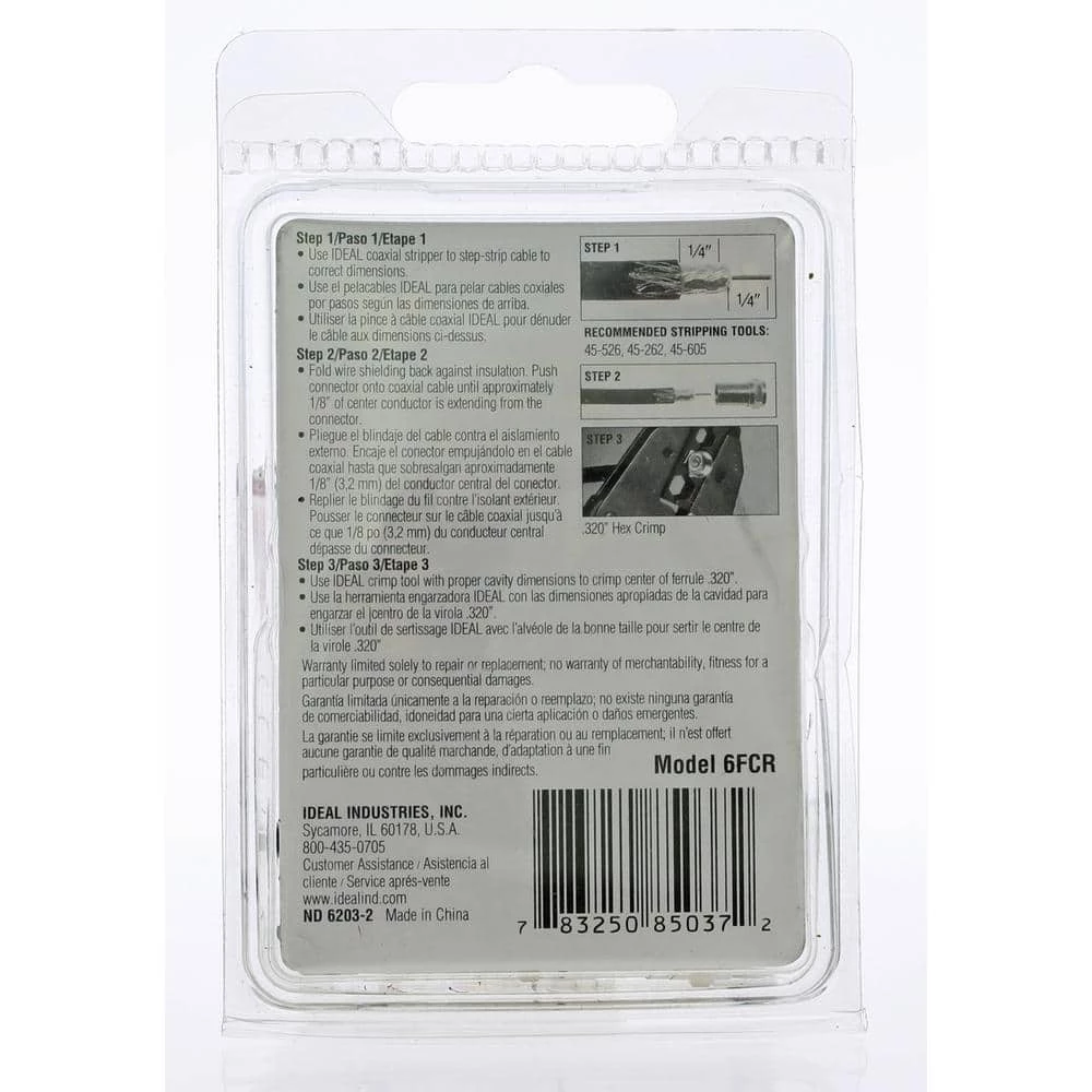 Nickel plated brass crimp sleeve connectors are designed for indoor coax terminations for standard video and other RF applications. Connectors require crimping with a hex crimp tool to secure the connector to the cable. Designed to accept RG-6 coaxial cables.