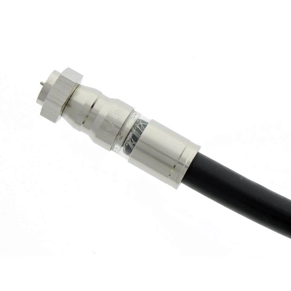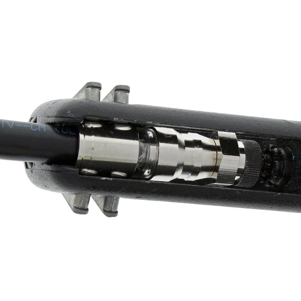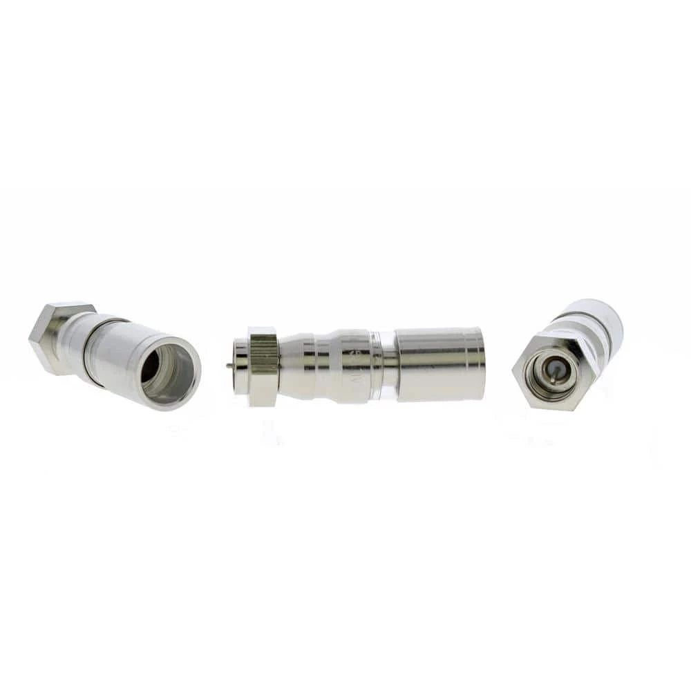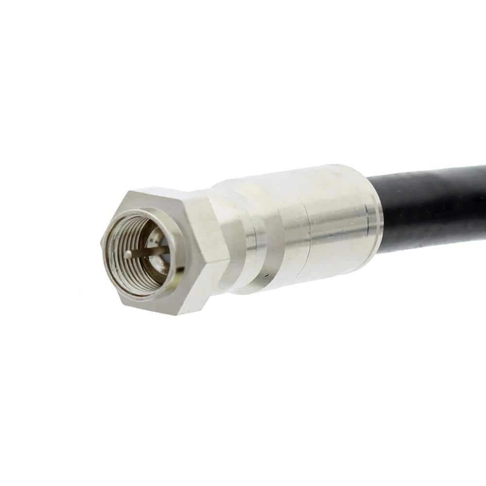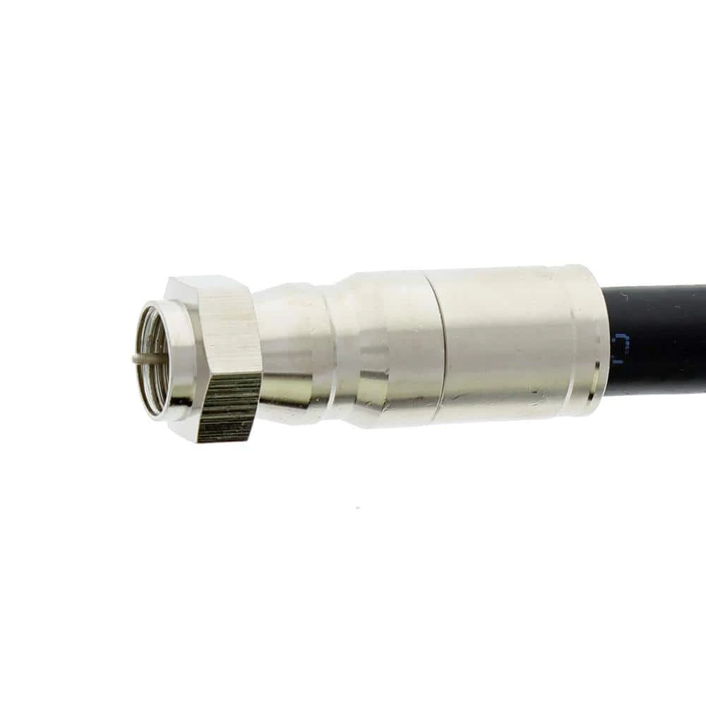 The RTQ F connector has been designed to work on RG-11 coax cables. Designed for 18-14 AWG solid copper center conductors. Requires a compression tool.