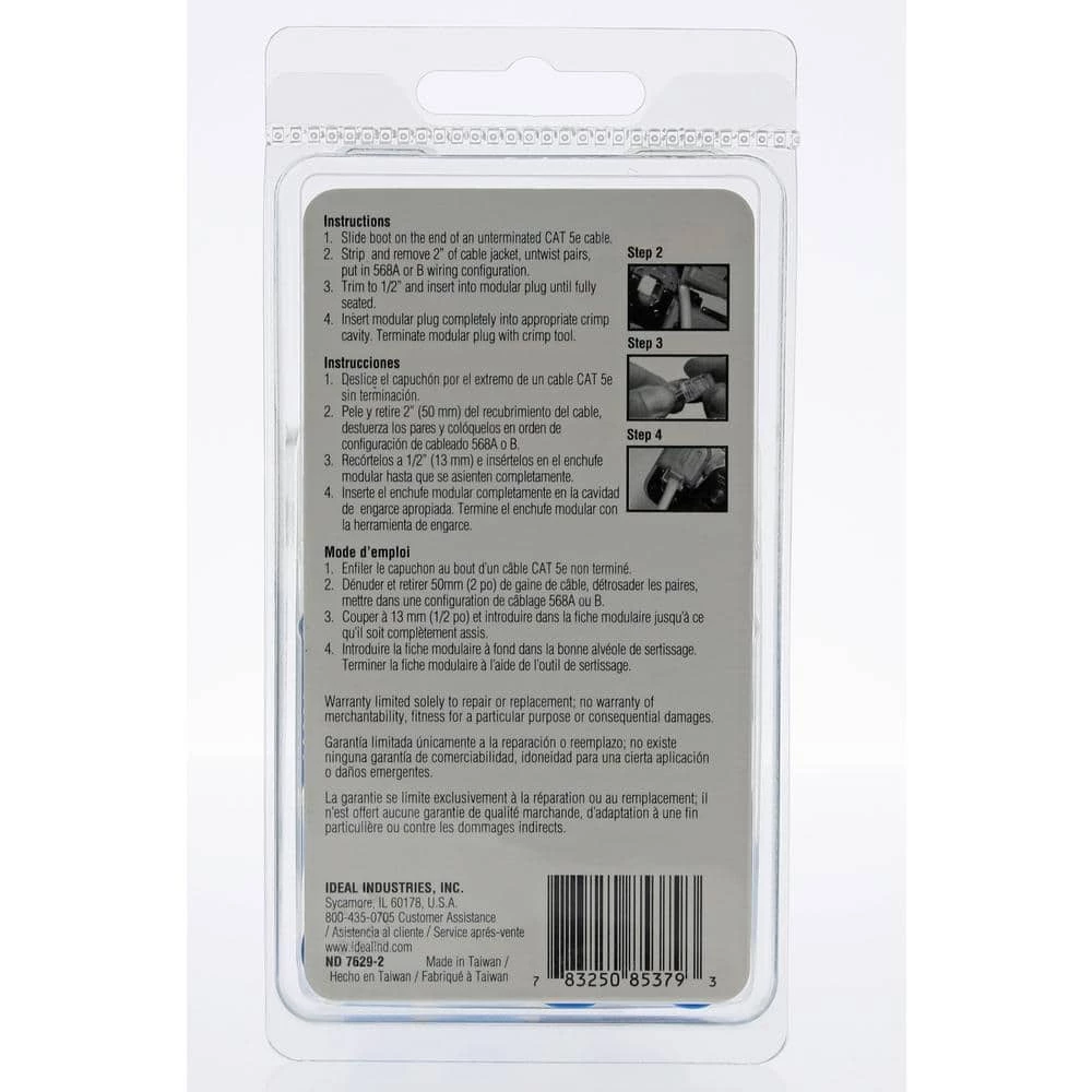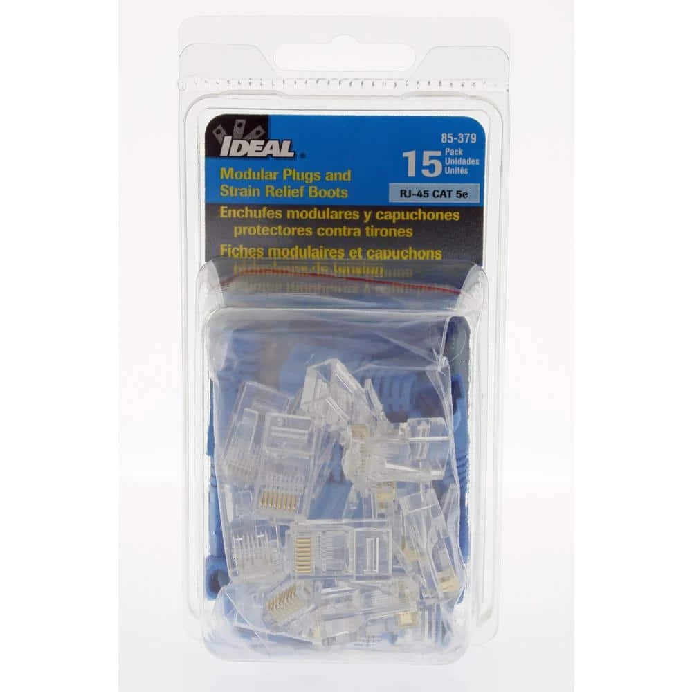 Cat 5e 8P8C (eight position/eight contact) modular plug connectors which support TIA/EIA standards for twisted pair cabling up to 100 MHz. Ideal modular plugs are designed to work seamlessly with the Ideal Telemaster series of modular plug crimp tools. Plugs are designed and manufactured to support all 100Ω cable wiring schemes including the widely used TIA-568A and TIA-568B configurations. Ideal modular plugs are manufactured to strict industry standards and tolerances that utilize traditional preparation and termination methods. These proven and preferred methods allow for improved compatibility among manufacturers and devices around the world without the need for special tooling or preparation methods and eliminate the risk of shorts and crosstalk often associated with open end or feed through type connectors.