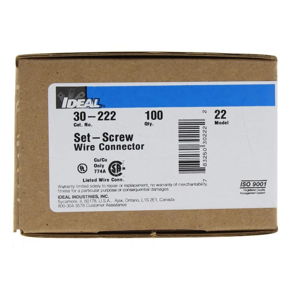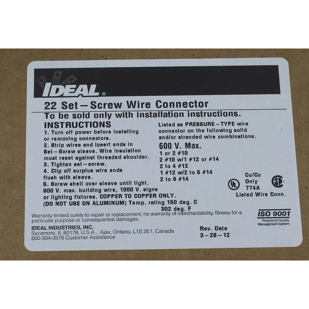 IDEAL’s set screw wire connectors ensure a vibration-resistant splice, perfect for applications near motors or other vibration. The solid brass sleeve insert allows wire ranges 20 AWG – 10 AWG. Each package contains plastic caps, allowing for insulation of the splice after installation, as well as a set screw holder to allow for ease of installation.