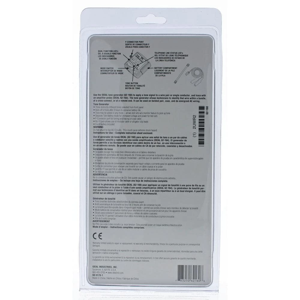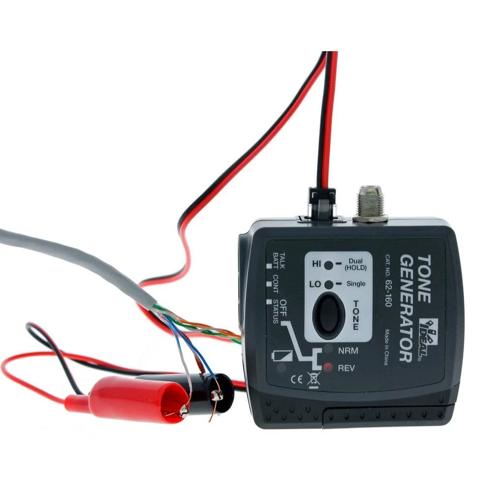 The 62-160 Pro Tone Generator is used to send an analog tone signal over copper cables to aid in identifying the location and identification of the cable. The signal is picked-up or amplified, by using the 62-164 amplifier probe (sold separately). The tone generator has both RJ-11/12 and Coax F-female interfaces to attach terminated cables directly to the unit. An alligator clip assembly is included to send tone signals on any de-energized copper cables including electrical cables, speaker wires, alarm cables and more.