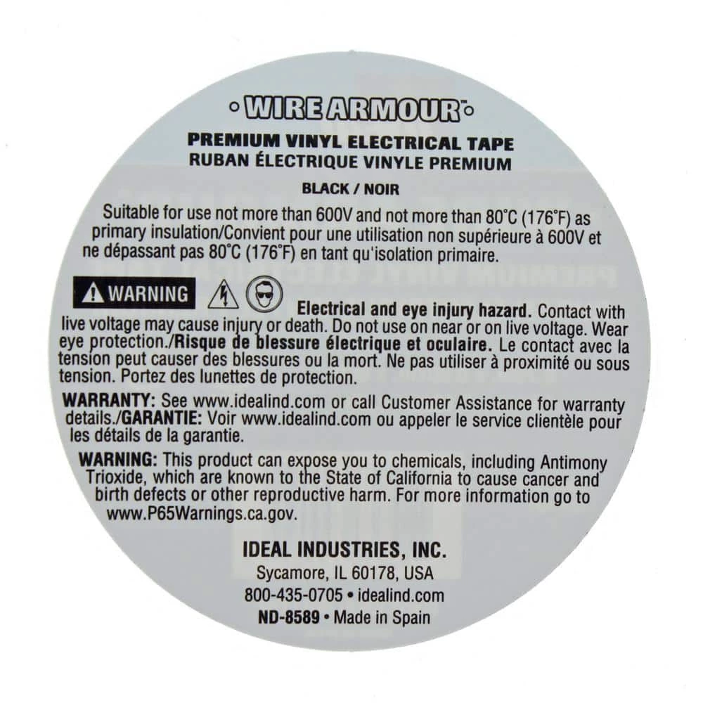 When performance matters, you can count on IDEAL Wire Armour Contractor Pro vinyl electrical tape to insulate and protect, stretch with strength, and bond in the toughest conditions and most critical applications at a great value. Commercial electric vinyl tape with blue core technology that provides high elasticity, that is flame retardant, high UV resistant that is impervious to water, oil, acids, alkalis and a wide variety of corrosive chemicals. Primary vinyl electrical tape use for insulation of electrical splices up to 600-Volt.